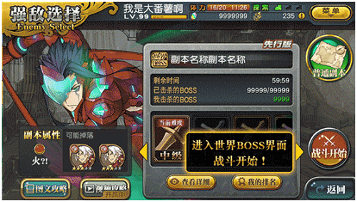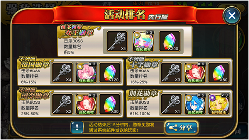 而随着参与人数的增加,玩家们还能够获得更丰厚的奖励以及更刺激的战斗体验哦。世界BOSS的奖励分为每场战斗奖励和活动结束后的排名奖励两种,每场战斗结束后都可以获得类似常规副本的战斗奖励,主要是强化经验素材和金币素材,同时活动结束以后会根据你击杀的BOSS分身数量的排名。奖励是根据百分比结算的,所以参与的玩家越多,能够晋升到前面阶段的机会就越大。只要努力,就能获得丰厚的回报哦!