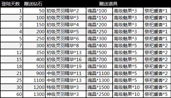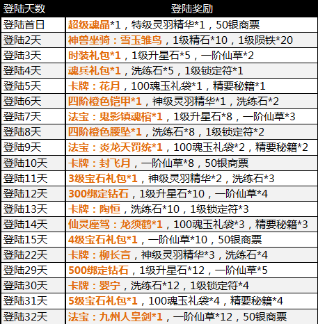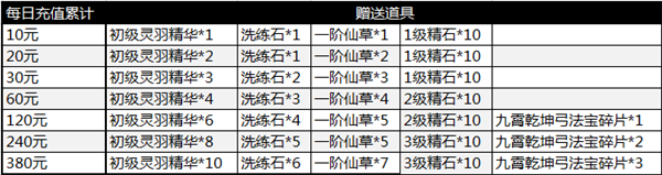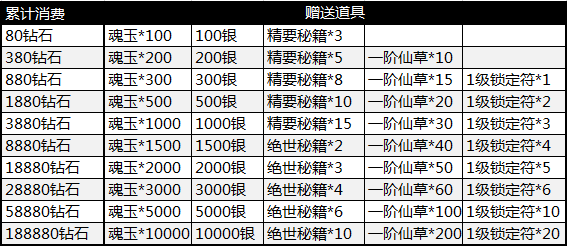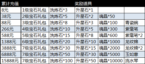 活动期间,累计充值达到指定金额即可获赠各种珍惜道具。累计充值奖励如下: