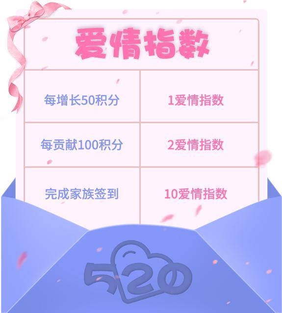 约上你的家族一起来参加520爱情派对吧!活动期间,点击“报名”并通过完成指定任务获得“爱情指数”,赢取丰厚奖励!