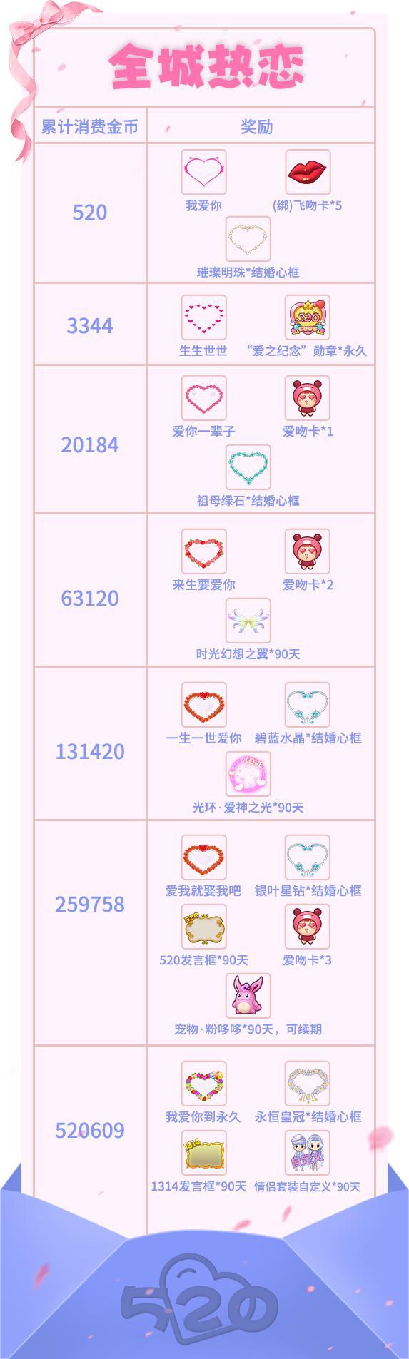 哇!这难道是超大型的表白现场吗!整座城市都沉浸在甜言蜜语中,仿佛有粉红色的气泡将它紧紧包裹!活动期间,伴侣双方共同消费金币累计达到相应数量,双方均可领取奖励!
