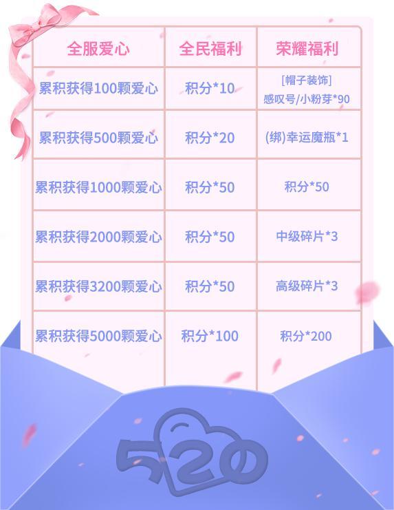 全民爱心:根据全服玩家累积获得的“爱心”总数,所有700积分及以上的玩家可以领取“全民福利”,在活动期间累积获得1颗爱心的玩家,还可以领取“荣耀福利”。