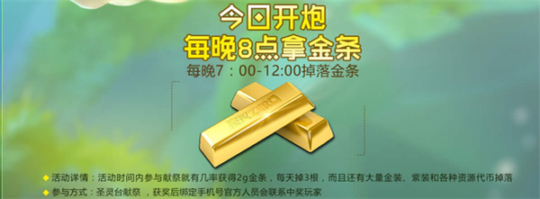 公测当天晚上八点随机掉落金条,首发后前7天全渠道掉金条!更有大量金装、紫装掉落~参与圣灵台献祭,获奖后绑定手机号官方人员会联系中奖玩家哦~