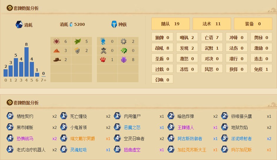 【术士卡组】经过好几个月之后,似乎很多玩家都已经忘记了一个流派。而这个流派在不久之前也登上了欧服天梯传说的位置,那就是万马奔腾术士,在之前恐惧战马出现的时候就引起了广大玩家的热议,这张卡牌4费1-1,虽然身材很差,但是亡语确实非常不错的。而很多术士也都开始
