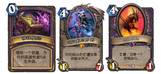 当我们的恐惧战马在场面上的时候,对手除非用沉默,不然是解不掉的。而在下一个回合我们放下瑞文戴尔男爵、配合死亡缠绕或者撞死小马,则可以产生出更多的恐惧战马,而配合玛尔加尼斯更是可以让我们的恐惧战马变大。解场斩杀都是不错的选择。