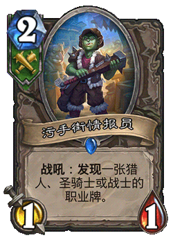 我们是强硬派。也就是说,加入我们的都是猎人、战士,甚至是圣骑士。 战士天性凶狠残暴,猎人则善于射击,而愤怒的圣骑士则是史上最高效的执法者。 他们确保了污手街的所有人都遵循一套法则——我们的法则。 有一点你必须知道,某些卡牌的法力值下方标有污手党的记号。 看上去就像是几个带钉的梅花。 如果卡牌有这个标记,就可以放入猎人、战士或者圣骑士的套牌,很不错吧?