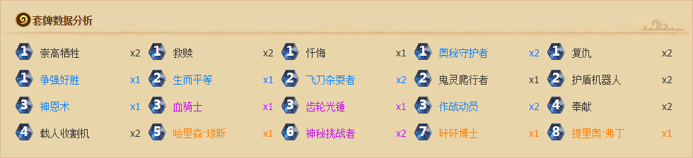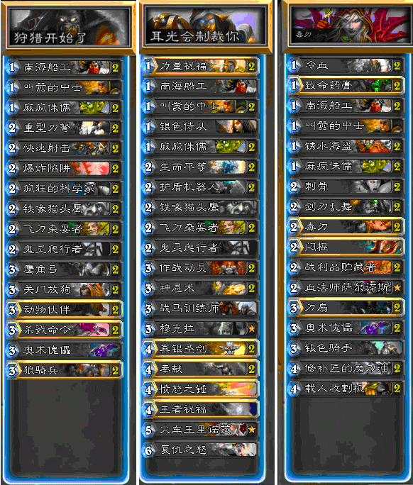 前言笔者是一个小玩家,每个月都会上传说,而且不止一个号。每次说到这,肯定会有人要一波卡组。其实大部分人卡牌收藏里都已经抄了很多登顶卡组。但很多时候无数个登顶套牌却带不来一个传说的卡背。 本文我想说些真正地上传说有帮助的内容,分为几个部分,剧透一下卡组在最后部分,看到那里可以抄卡走人啦 :) 环境理论有些同学可能没上过传说,看一些主播的直播上传说就抄卡去打,结果不升反降,于是怀疑自己的技术,怀疑自己的运气怎么这么差,心态慢慢也就没了,满怀激情的冲天梯也成了送分。某大神在3级一波德鲁伊上传说,某小虾抄了在8级打,可能被虐到10级。每段的环境不同,这一点极其明显。 说个真实例子:9月小弟打了7个传说,最近一个9月18号,4小时从7级打到传说,晚上无聊,给我的房管打天梯。他5级,本来以为能很轻松直接用我1级卡组上分,结果掉到7级。我真的尽力了,奈何被乱拳打死老师父。 简而言之,三级,甚至四级以内卡组相对稳定,再换句话就是你法师开局下个齿轮大师,我就知道你卡组有安东尼达斯,没有火妖。我甚至知道卡组肯定没有奥秘,这一点5级开外,就完全不同了。( 什么?你1级,卡组就带死亡之翼? 当然是有个别情况)而且越是天梯高手越喜欢稳定性高的卡组,速度相对慢一些。 我说这些,只想佐证我的观点,想打一个好排名,先会使用一些合适的卡组(不是一个卡组就能全程轻松搞定的,当然奴隶战当我没说咯。) 如果你打出一个好成绩,不要用卡组去找环境的麻烦,请针对环境换卡组。这里简单说一下克制关系,我的粗略理解,大概是够用,假设你每天玩炉石都在跟同一个人不断对弈,他只是不停换卡组,不停输给你又赢你,不停跟你发抱歉。下面是对面的卡组跟你该使用的卡组。 对面的卡组 :奴隶战 你:大王术,豪战,很稳,机械法也很可能快速推死他。 对面的卡组:手牌术 你:中速猎,中速骑(双生平,快乐的抢血吧),穆克拉神恩骑士,T7 对面的卡组:中速猎 你:德鲁伊,T7猎 奴隶战(有人觉得中速克小德,但是我小德现在吃了很多中速具体这里不说) 对面的卡组:机械法 你:动物园,佛祖骑,中速骑,中速猎 龙牧 对面的卡组:佛祖骑 你:不卡手 对面的卡组:德鲁伊 你:求他不胡,机械法等铺场职业‘ 对面的卡组:豪战 你:小德稳吃,机械法在豪战没小福子情况下也稳吃。豪战跟机械法关系很暧昧。。有小福子反而克制机械法 对面的卡组:牧师 你:豪战,乌龟站。德鲁伊 吃牧师比较稳,快攻职业需要看牧师1,2费卡手程度。 这里我并不详细说攻略,因为对每个职业都有太多话要说。 这里有些职业或卡组使用的人很少,我就不都说了,克制手牌术我并没说爆牌贼,所以不提萨满也是情理之中吧。 p.s:我深爱盗贼,目前除了刀油贼并没其他成型套路,而且我觉得刀油贼卡序合适并没有明显害怕的职业。这个职业相当需要卡序。呼天喊地说被豪战完克的都是些跟风的人,根本不了解刀油贼。既然发文章,也不怕被喷。我就是这么想的。 挺怕手牌术的。 晋升传说的实力分级笔者从小就喜欢玩游戏,也喜欢总结攻略,这里把上传说的实力进行分级。 1、可以利用连胜达到5级,但是总是掉下来,然后再打回去,每天重复。 2、可以在5级站住,不会掉到5,能达到4或者3,但是3级星星不多又会输回来,但不会掉出5。 3、稳定3级,但是达到1级后很难胜利去渡劫。 4、传说。 找到自己的定级,这里我要说的将会让你进入下一级。 p.s.如果你在第一阶段就想直接传说。。。那恐怕有点难,不知道该怎么说。。 我们玩游戏都是为了快乐。如果上传说你就快乐了,并不需要技术傲视同群。那么我的建议是, 使用投机卡组。 投机卡组你可能会说我在扯淡,这都什么烂卡组,T7早就淘汰了。 那么我要问,T7不适合环境是道听途说,还是亲身尝试的呢?当然我这里不是让你用这套卡组冲分,正确理解我的意思,当你达到自己实力的阶段,无法前进,这些卡组虽然有风险,但是有可能会帮助你更进一步。 说实话,这些卡组对你的提升技术不会有太大帮助,但是合理使用仍然可以打破僵局。这里以T7为例,一颗水晶一点伤害的核心仍然可以抢上传说。当然合理的使用水晶才是真正的T7,如果你只是抓什么打什么,效果会差很多,但是也不是没有投机成功的可能。 总之如果你还是不信,那么 不管你信不信,反正我是传说了。这些卡组的使用不许要太多的技术、大局观理解的支持,但是如果你的目的就是排名更高更快更强,祭出这些卡组偷一把鸡,胜利就这么简单。 结语如果你坚持看到这里,是时候说句心里话了。我知道随手发个主流卡组附上传说截图几句攻略肯定更讨巧,很多水友快快乐乐的抄卡打天梯去了。可是过半小时,我保证还是一切照旧,分段搞不好不升反跌。 每天网站都有很多卡组,但是传说、登顶的也还是那些人。 我真的希望有人理解,能从这里取得帮助。 卡组太多,附上我昨晚使用微调的骑士,你也许会把它归类成投机套牌,顺手为他点个鄙视,但是你不能否认他依然有效。 |