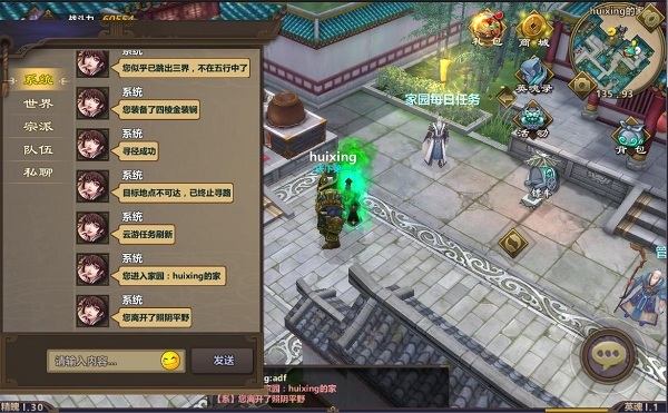 游戏中的聊天系统,大大方便了玩家间的交流,可以通过聊天系统,快速的添加好友,邀请组队,邀请宗派等等。在主页面内,玩家可以看到最近的系统消息,玩家喊话,组队邀请等等。