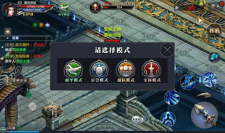 《皇图》手游中设置了多种战斗模式,玩家可以自由更改自己当前的攻击模式。那么接下来小编就带领大家一起去了解一下这几种模式。 游戏主界面人物属性右侧有一个圆形图标,默认状态下显示为绿色和平鸽图标,代表玩家处于“和平模式”。点击该图标,会弹出更改攻击模式的界面,点击图标选择,即可切换为该模式。