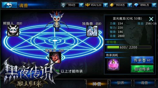 图03 神兽进化形态 神兽分为幼年、成年、幻化、神兽四个形态,形态越高,获得属性越多,能力当然就越强哦,每次进化有概率成功,失败可以累积幸运值。幸运值越高,进化成功率也变得更大,如果幸运值满的话下次必定能进化,赶紧带上你的神兽一起爆发吧~ 带着你的新萌宠一起上阵杀敌吧!手游《黑夜传说之狼人归来》8月全新资料片下周全面来袭,新佣兵系统、狼人装备系统、精装系统、陇西之地副本冒险、称号系统、鲜花系统等新鲜玩法邀你来尝鲜,一起开启焕然一新的冒险旅程。 关于《黑夜传说之狼人归来》: 人气明星“佟丽娅”倾情代言推荐,3D动作手游之王《黑夜传说之狼人归来》重新定义动作手游!全息三维立体画面、多段连招,无限连斩,极致打斗、击飞浮空、变身狼人、大型军团战等玩点著称,堪称2015年最刺激最爽快极致动作手游,开启动作手游的革新时代。