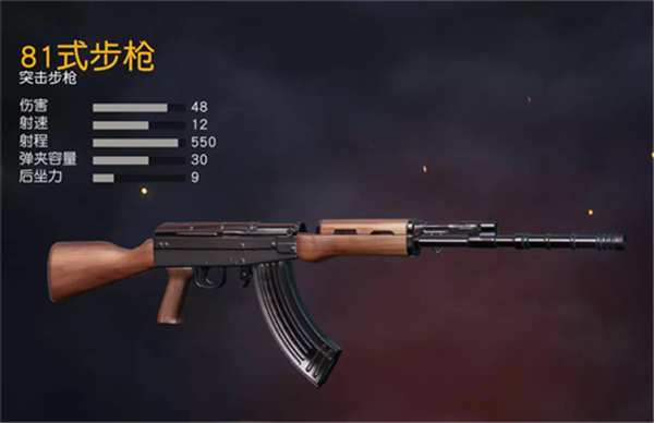 81式自动步枪的综合性能十分优异,拥有目前游戏中突击步枪里最高的射速(12)以及最低的后坐力(9)。同时它的伤害达到了48,这样的威力在游戏中的突击步枪系列里是仅次于APS水陆步枪的,火力输出可以说是非常强大。