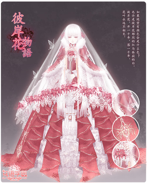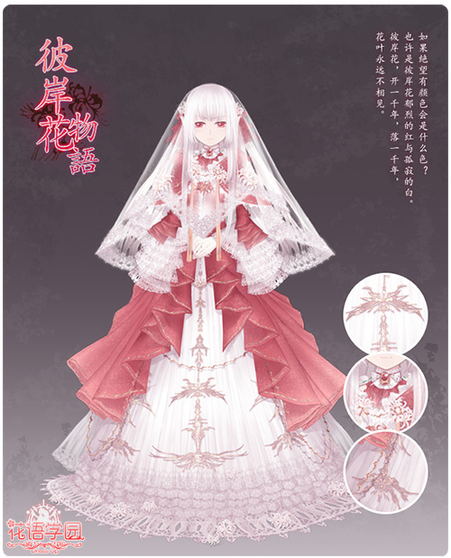 曼殊沙华套装细节展示 自己动手,将一套嫁衣收入囊中,这种感觉似乎很棒呢。喜欢这套特殊的礼服,快来下载《花语学园》吧,还有更多不同风格的礼服等待你亲手制作完成哦~ |