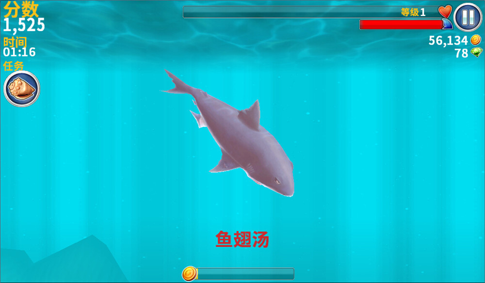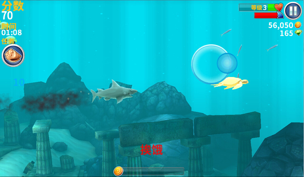 在生命值低到一定程度时,鲨鱼的身体会变成红色,并且下面会闪现“挨饿”等字样,这时候就需要进食来恢复生命值,但是,千万不能慌不择食,不是所有的鱼类都能吃的,水母等千万不要去吃哦,剩下的还看大家自己去发现了!