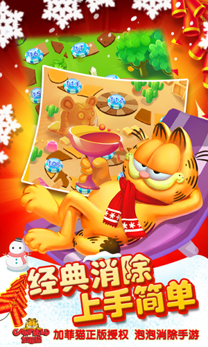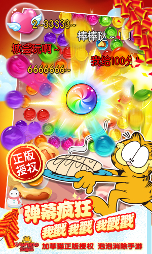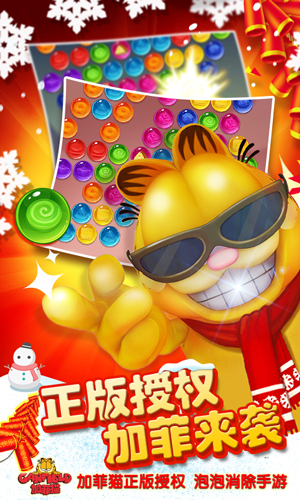 由中青宝发行的萌蠢搞怪泡泡龙手机游戏《加菲猫泡泡大战》,22日推出贺岁版本,为玩家带来全新的新年新乐趣。陪伴你度过2016的朋友们来做客了!宇宙超人气37周年经典贱萌偶像,加菲猫闪亮登场!还有蠢萌小伙伴欧迪、尼莫尔!快拿出你的猪肉卷,意大利面,冰激凌,对了别忘了还有老鼠哦!以加菲猫为原型的全民亲子益智手游《加菲猫泡泡大战》22日多渠道强势首发,你!不容错过!