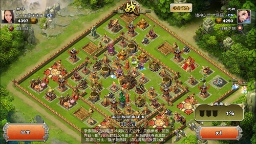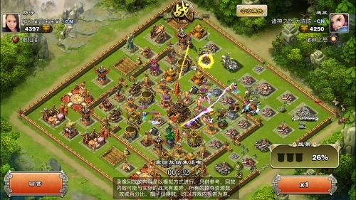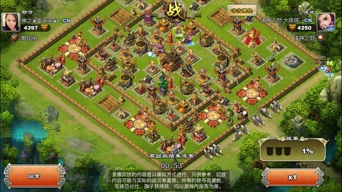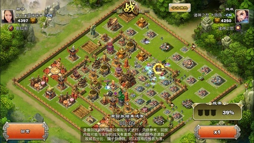 可以说雷宋宋的城防在等级上已经接近满级,城墙也都升级为满级,这给进攻方大陈陈带来了极大的挑战! 那么这场战斗到底谁更胜一筹呢?让我们来回顾一下! 1.首先大陈陈在战场最右侧放下一个刀盾兵,试图探一下是否有外置的五雷!可见是一个战斗经验非常丰富的主公!在没有探得五雷后,大陈陈放心的放下两个武将----诸葛亮及偃师月英。接着在4点钟方向放下战象,并配合少许炸弹牛破开城墙,与此同时,又放下了少量的弓骑兵配合清边。