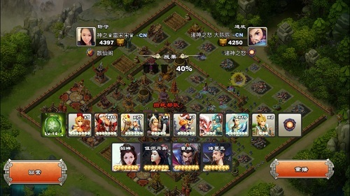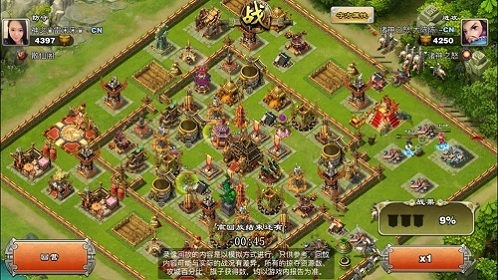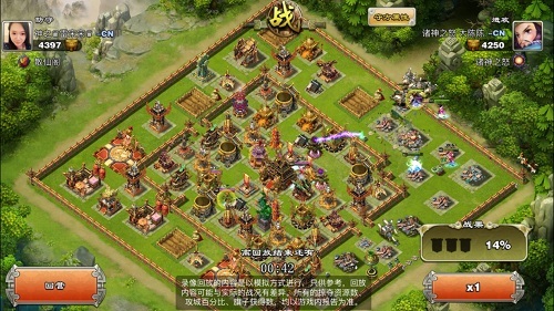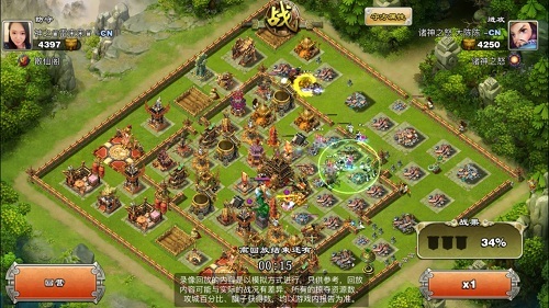 3.城墙破开,随后偃师月英释放了技能,小车炸毁了外围的两个弓弩以及一个弓箭塔。这时大陈陈放下了两个太平道人,太平道人立刻放出狼魂随军出战,而太平道人在一旁打着金墙。接着大陈陈在两点钟方向放置了一个战象和少许炸弹牛,破墙后放下一些弓骑兵配合清边。