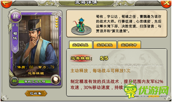 荀攸:4星第一辅助,满级技能提高62%攻速和30%移动速度,刀盾弓箭猥琐流首选辅助!谁用谁知道! 满级更是激活贾诩,郭嘉,荀彧,程昱天命! 星级指数:4星