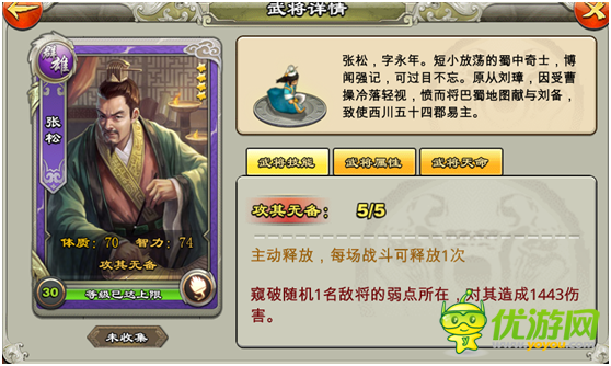 张松:我们都是神枪手每一个技能消灭一个敌人~主动技能1443伤害 5星以下肉基本一招秒杀攻城利器!满级解锁法正杨修天命 星级指数:4星