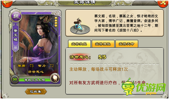 蔡文姬:主动技能对所有友方武将进行治疗,近乎80%的血,关键时刻你有力地肩膀,快打完仗释放可以减少疗伤时间!满级可激活司马昭天命 星级指数:3星半