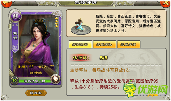 甄姬:7天登录送的武将,4星第一奶妈,可惜奶水不是太给力,有5星就需要替换,没5星前期可一直当做主力奶妈用,满级可解锁大乔小乔天命。 星级指数:4星