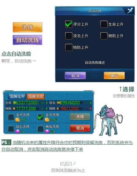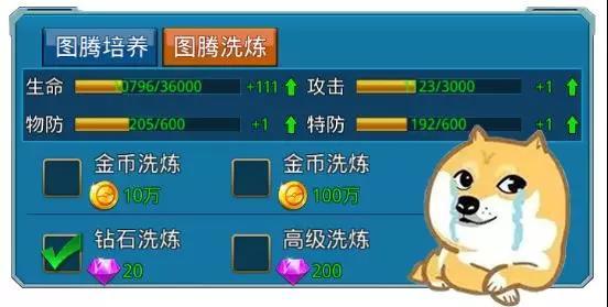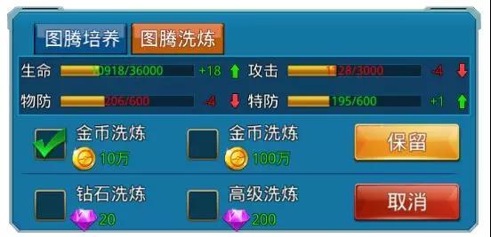 图腾洗练分为金币洗炼与钻石洗炼,使用金币洗炼可能会出现属性下降的情况