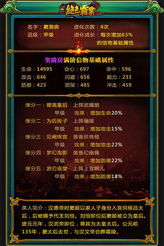 窦漪房能为你带来接近50000的基础生命属性,激活其美人缘分,还能再获得20%的生命属性加成,实际计算下来的数字无疑是恐怖的,血量轻轻松松突破六位数! 生命值是一切的根本和基础,血越多越不容易挂。因此,携带窦漪房上阵杀敌,无论对手用多么强大的攻击,你都能够依靠着超大血量抵从容迎战! 另外,拥有超高的生命属性窦漪房,和有治疗技能的美人配合起来的话,带来的效果将更加强悍,治疗量过万不是问题。只要你站得稳,你就是赢家!因此,当你血量暴涨之时,就是你预见成功之日! |