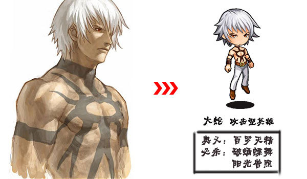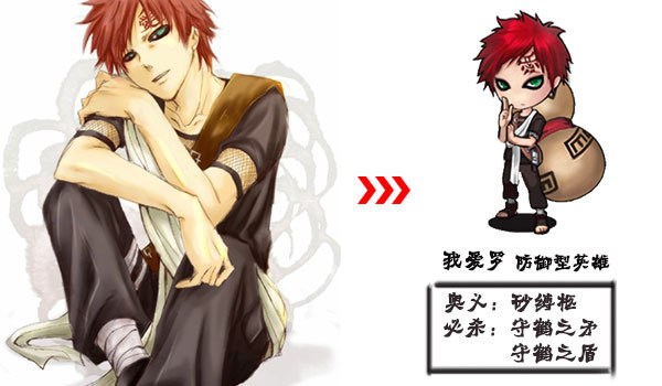 原型:八岐大蛇(左一),《拳皇》第四作《拳皇97》的最终BOSS。对,没错 就是这个眼神带着忧郁的白发硬汉! 第二位英雄:我爱罗 风之国-砂隐村的第五代风影。 基础属性:生命值:229 攻击值:103 防御值:41 速度值:105 基础战力:189