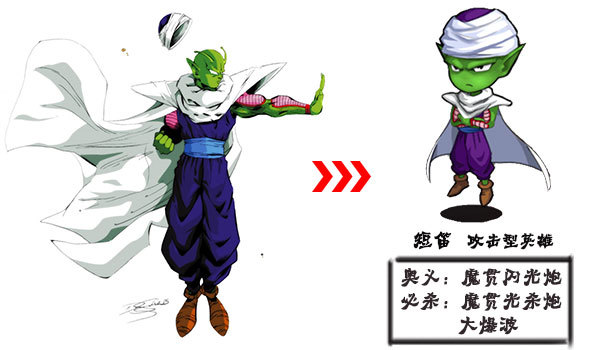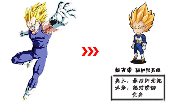 原型:笛子魔童,《七龙珠》中的重要人物。以打败悟空为目的最后被影响共同守护地球的绿色皮肤英雄。 第六位英雄:维吉塔 外星贵族的王子,拥有极高的自尊心。 基本属性:生命值:158 攻击值:79 防御值:41 速度值:110 基础战力:151