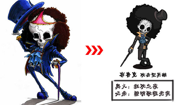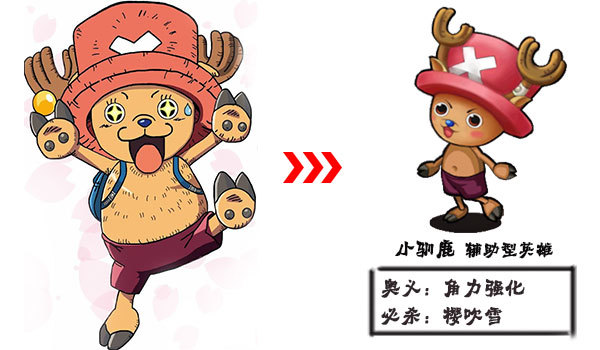原型:布鲁克(ブルック, Brook),《海贼王》中的人物。号称“鼻歌”,草帽海贼团音乐家。据说是个歌声很优美的骨干帅哥。 第十位英雄:小驯鹿 可以直立的驯鹿,是草帽海贼团的船医。 基本属性:生命值:161 攻击值:78 防御值:41 速度值:110 基础战力:151