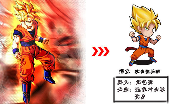 原型:妮可·罗宾(ニコ·ロビン ,Nico·Robin)《海贼王》中的女二号。据说是一位身材火辣的美女子。 第四位英雄:悟空 一个坚强不屈,有着一颗仁慈的心,并且掌握地球命运的人 基本属性:生命值:218 攻击值:104 防御值:41 速度值:120 基础战力:188