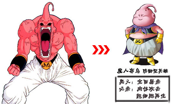 原型:贝吉塔,《七龙珠》中的主要角色。赛亚人的王子,聪明而又自尊性极高的人物。 第七位英雄:魔人布乌 拥有无限再生能力的恐怖家伙 基本属性:生命值:229 攻击值:103 防御值:41 速度值:120 基础战力:189