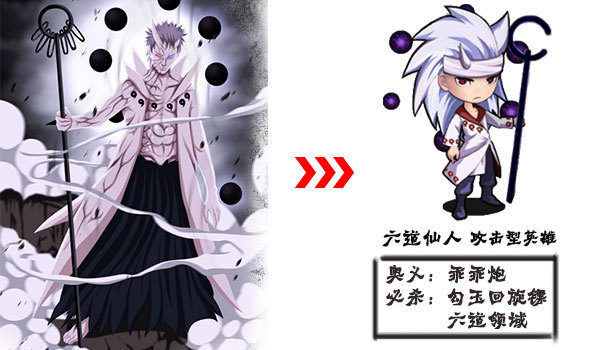 原型:魔人布欧,日本动漫《七龙珠》中的反派角色,《龙珠Z》原著中最终BOSS。对,没错,是这个看起来粉粉嫩嫩的小胖子,但是不要小瞧他,变身之后的布乌战斗力达到了一种逆天的地步。 第八位英雄:六道仙人 宇智波一族前任首领。 基本属性:生命值:218 攻击值:104 防御值:41 速度值:115 基础战力:188