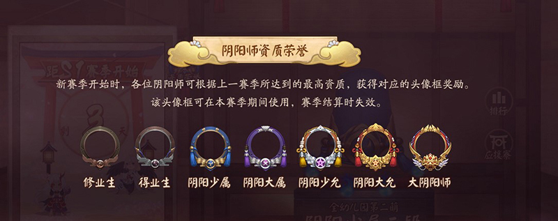 为了答谢阴阳师大人们的厚爱与陪伴,在S1赛季开始前(3月30日版本更新前),资质最高达到修业及以上资质的阴阳师,可以获得对应资质的头像框,该头像框可以在S1赛季期间使用,赛季结算时失效。