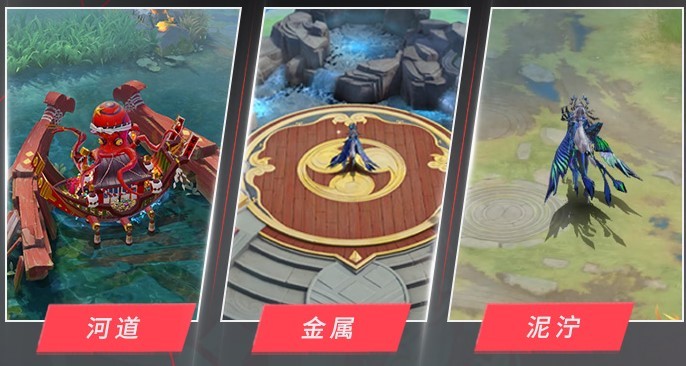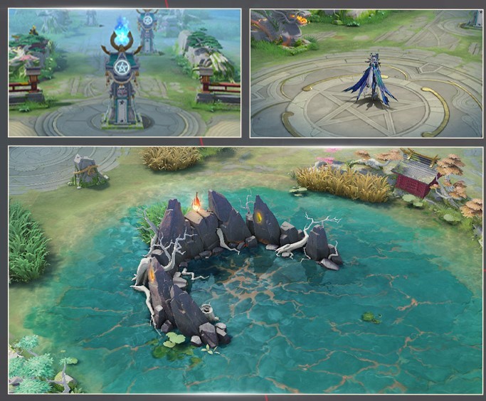 加强战场的光影律动,增加实时光照,动态展现云影、水底与模型表面流光,拟真的水面天光反射、水体折射和焦散表现,最大程度还原真实水体,真实展现水面的力场效果,式神经过河道时,会随脚步踩出水纹。