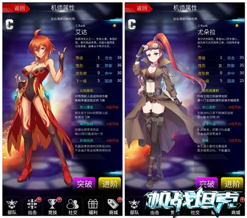 【御姐向】 艾达:性格火爆、争强好胜,喜欢挑战极限。但头脑相对简单且记性很差,做事从不考虑太多。 火焰旋风——对周围敌人造成持续伤害,有概率摧毁接近的飞弹 怒火爆发——B级开启,生命低于35%时释放火焰,能够摧毁飞弹 幽灵漂移——A级开启,3.5秒触发一次,回避全部单体攻击 异常抵抗——S级开启,负面效果持续时间减少50% 尤朵拉:曾是no.1赏金猎人,为了报答他人的救命之恩而义无反顾的投身战场。 加农炮速射——所有主炮立即装填发射,第一门主炮射速和装填速度大幅提升 会心连射——B级开启,主炮28%几率连射且不消耗弹药,内置CD1秒 连续作战——A级开启,击杀敌人回复生命值15%,队友击杀回复量减半 野性——S级开启,生命越少伤害越高,最多提升35%