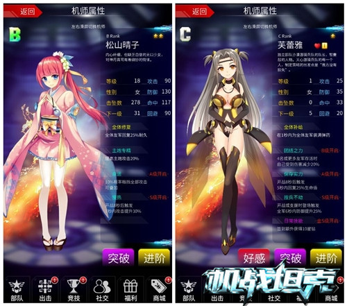 【少女向】 松山晴子:内心纤细,但缺乏自信的无口少女。 全体修复——全体友军回复25%耐久 主炮专精——提高主炮攻击20% 幸运——A级开启,10%概率格挡全部攻击,可叠加 慢热——S级开启,开战8秒后触发,7秒内攻击提升30% 芙蕾雅:独立军队“沙漠游骑兵”队长,智囊般的人物,关心游骑兵队伍的每一个成员,制定策略的出发点永远是“我方没有损失”。 全体补给——在1秒内为全体友军装满弹药 团结之力——B级开启,4名或更多队友存活时,自身受到的伤害减少20% 保存实力——A级开启,开战8秒后触发,5秒内回复25%生命值 按兵不动——S级开启,开战或支援时登场触发,6秒内全军防御提升25%