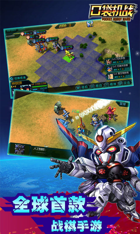 承载着许多人的童年回忆!首款Unity3D引擎打造的S·RPG卡牌游戏《口袋机战》,是以多达百架机甲相克相成为基本构架,民间势力联合反抗DC统治的战争为背景题材的新颖手游。在游戏里,玩家将操作帅气而不失强悍的机甲登台,加入对抗DC的战争中。在广袤大地,无垠宇宙空间中经历追逐与反击,一切为正义而战! 【集结】 游戏一开始就能获得主角机甲以及任务送的A阶合金魔神,但是想要更多更强大的机甲来壮大自己的队伍时,那就可以利用研发中心系统来取得更多机甲。须知:不要小看这些看似普通的小伙伴,它们培养到一定等阶后,可合成强大的终极机甲!