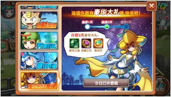 4.增加基拉祈祈祷活动 夜空的许愿星,连续三天登陆游戏许愿可以获得豪华大礼哦,精灵之魂、精灵石、觉醒之石一个都不少~,一大波福利正在路上哦!