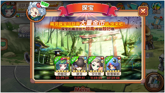 6.增加探宝玩法 训练师大大们,在游戏的过程中,你是否觉得游戏金币不够用呢?强化、重铸、觉醒处处都需要着大量游戏金币的消耗!怎么办呢?探宝玩法就帮了我们的大忙,只需选择出战精灵和出战时间,金币就会哗哗到手!嘛嘛再也不用担心我的金币不够用啦~