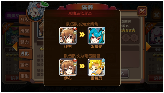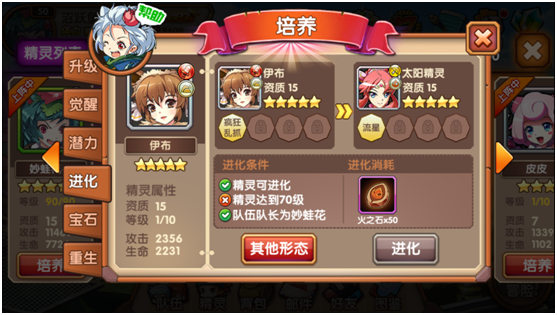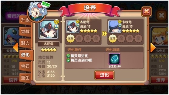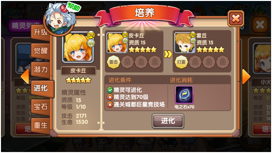 1.增加精灵进化功能 一般来说,可以进化的精灵在满足等级、进化石数量的要求即可进化。除此之外,部分稀有和特别的精灵也有着额外的进化要求。为了心仪的小精灵,各位训练师们可要看好哦~