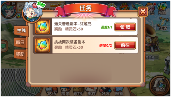 8.增加主线任务 主线任务可以帮助我们更快更好的属性游戏的玩法和侧重点,帮助我们更快更好地提升自己的队伍,以便我们更好的体验到《口袋联盟》的魅力所在,让我们愈加轻松的享受着精灵收集的乐趣!