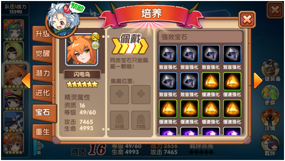 7.修改宝石系统为可佩戴到精灵身上 现在的宝石可佩戴在精灵身上,每只精灵随着等级的提升可佩带的宝石数量也随之提升,最多可以佩戴4颗宝石,不过需要注意的是,相同属性的宝石不能重复佩戴哦!合理的宝石搭配可以帮助我们更容易的取得战斗的胜利呢!