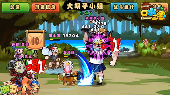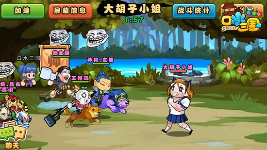 【鬼畜全明星配音,蓝猫也来助力】 游戏里的配音除了有《口水三国》动画原班人马倾情加入,胡子女神Ladybeard,蓝猫配音演员葛平,还有暴走大事件的王尼玛和张全蛋。设想下操着蓝猫口音的左慈,粗大嗓音的貂蝉,还有贱萌贱萌的诸葛亮,画面不敢想,请至游戏内亲自感受。