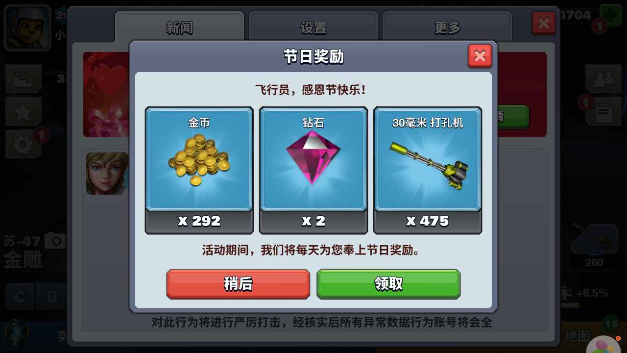 感恩有你二:每日登录即可领取丰厚节日奖励 每日固定奖励:钻石*2~5,金币*200~500 每日随机奖励:导弹*40~80,机炮*400-800,芯片*20~50