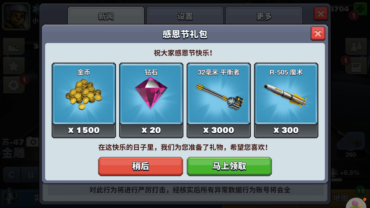 感恩有你一:登录游戏即可领取感恩节大礼包 钻石*20,金币*1500,R-505魔术*300导弹,32毫米平衡者*3000机炮