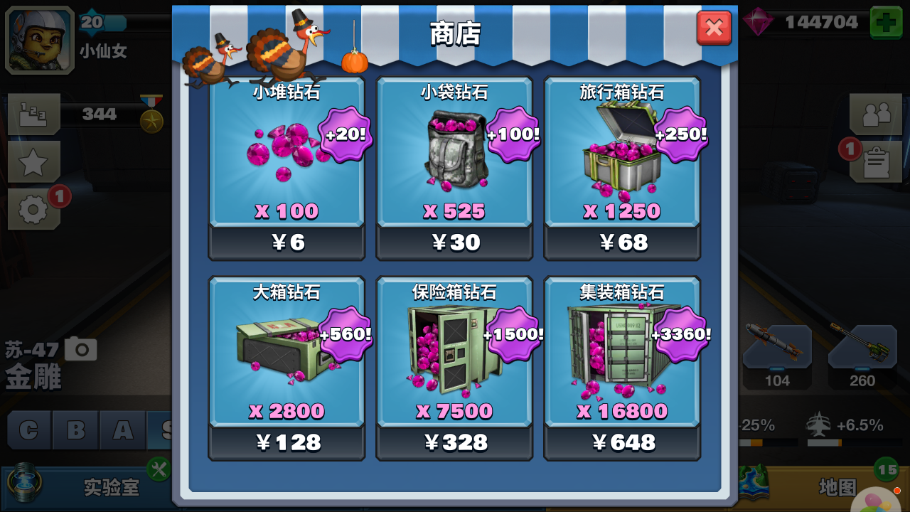 感恩有你四:在商城购买任意钻石包即可额外获得20%钻石奖励,此时不买更待何时? 小堆钻石:100+20 小袋钻石:525+100 旅行箱钻石:1250+250 大箱钻石:2800+560 保险箱钻石:7500+1500 集装箱钻石:16800+3360
