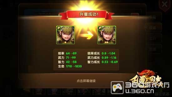 想要提升武将的基础属性吗?那就为武将“升级”、“升星”吧。不但可以提升武将的生命、武力,还可以提升武将的统率与智力哟!全面提升武将实力、培养绝世悍将就在于此。
