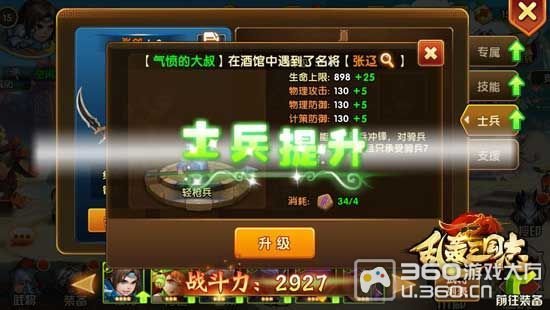 当然,也要培养士兵。《乱轰三国志》士兵也是分兵种的,不同属性的武将带领相应的兵种,玩家对士兵进行升级培养,也会有一定战力提升的!