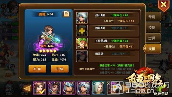 一个好汉三个帮,《乱轰三国志》武将“支援”玩法也能极大的提升武将的战斗力。每一位武将都有固定的支援武将,可增强一定的战斗属性,支援的人数多,还会有额外加成哟。