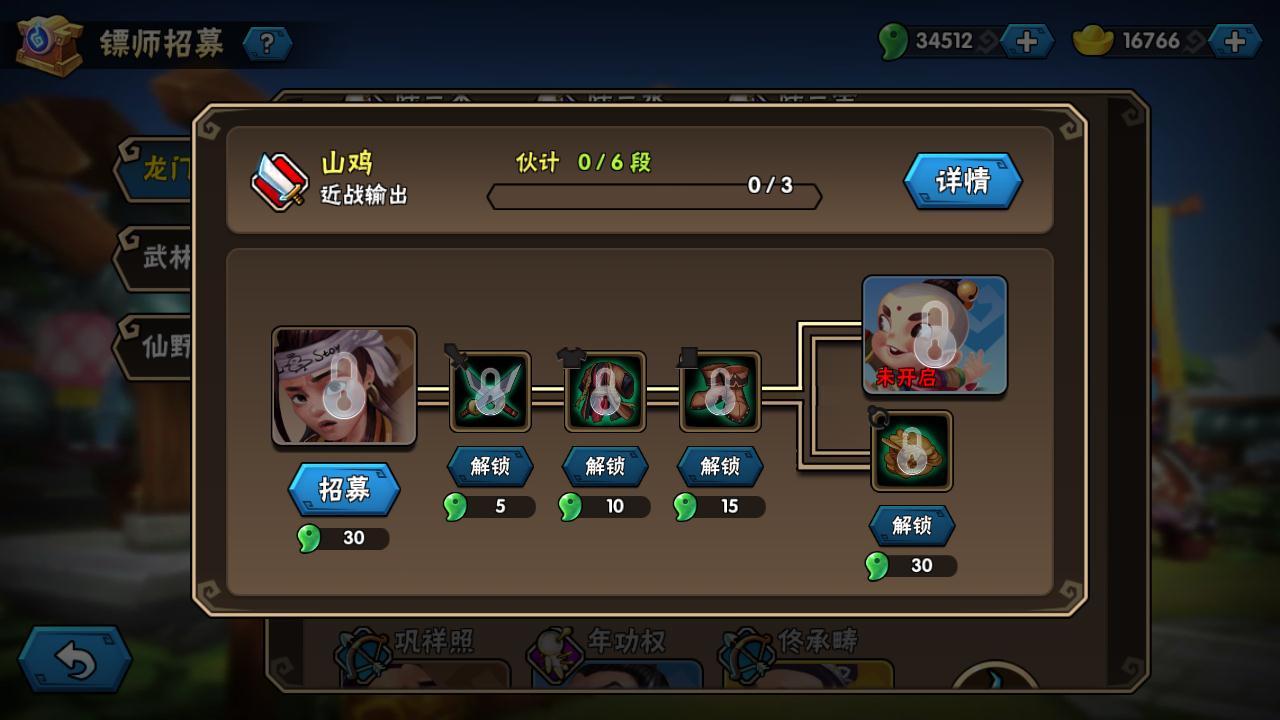 镖师解锁 图中可看到,每位橙色镖师都对应两个低品质的镖师,想要获得橙色镖师需要从左侧开始逐级招募角色,招募之后解锁相应装备才会开放下一级招募的权限,每次招募解锁都需要消耗一定数量的勾玉。