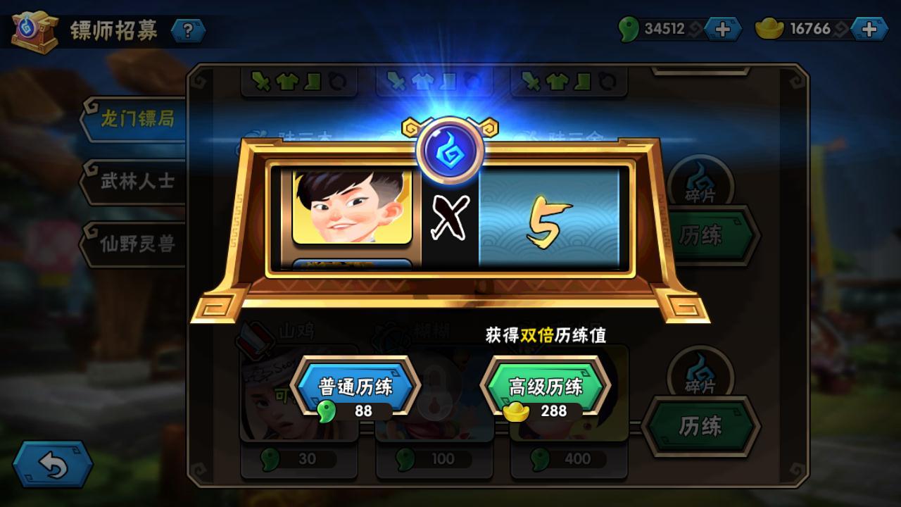 镖师历练 在橙色镖师的右侧可以看到镖师历练的图标,点击之后进入下图所示界面。通过使用勾玉或元宝即可进行历练。随机提升该条线上任意一位镖师的段位等级(高级历练可获得双倍段位经验)与全属性,将战力大幅提升。